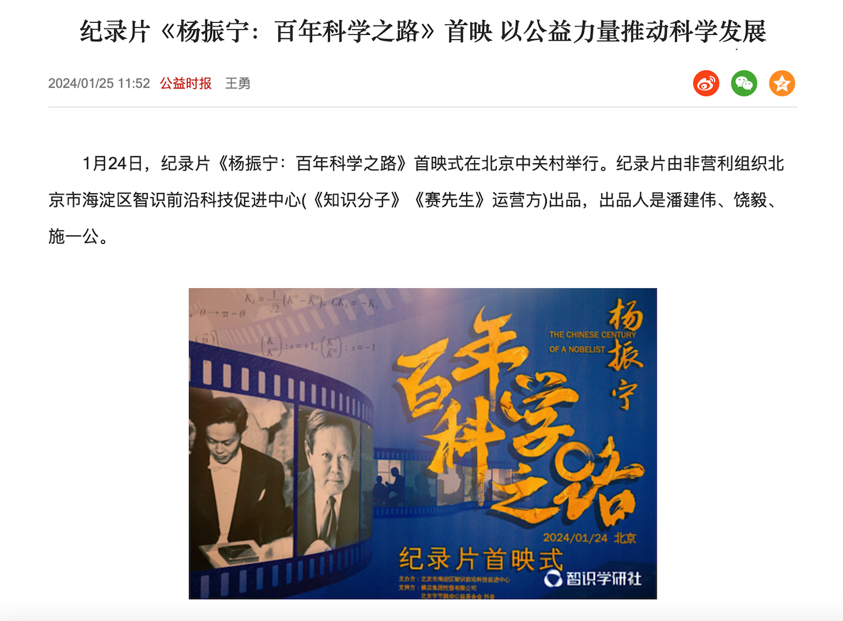 (公益时报 王勇)1月24日,纪录片《杨振宁:百年科学之路》首映式在北京中关村举行。纪录片由非营利组织北京市海淀区智识前沿科技促进中心(《知识分子》《赛先生》运营方)出品,出品人是潘建伟、饶毅、施一公。